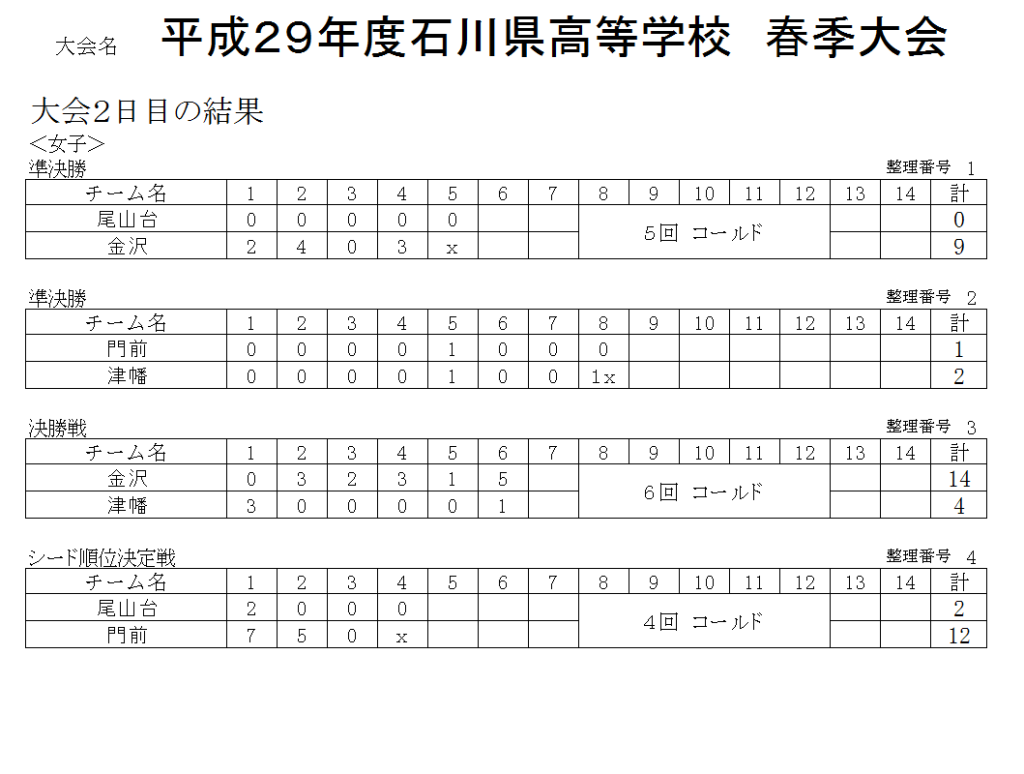 平成29年度石川県高等学校 春季大会 2日目の記録(スコア―)