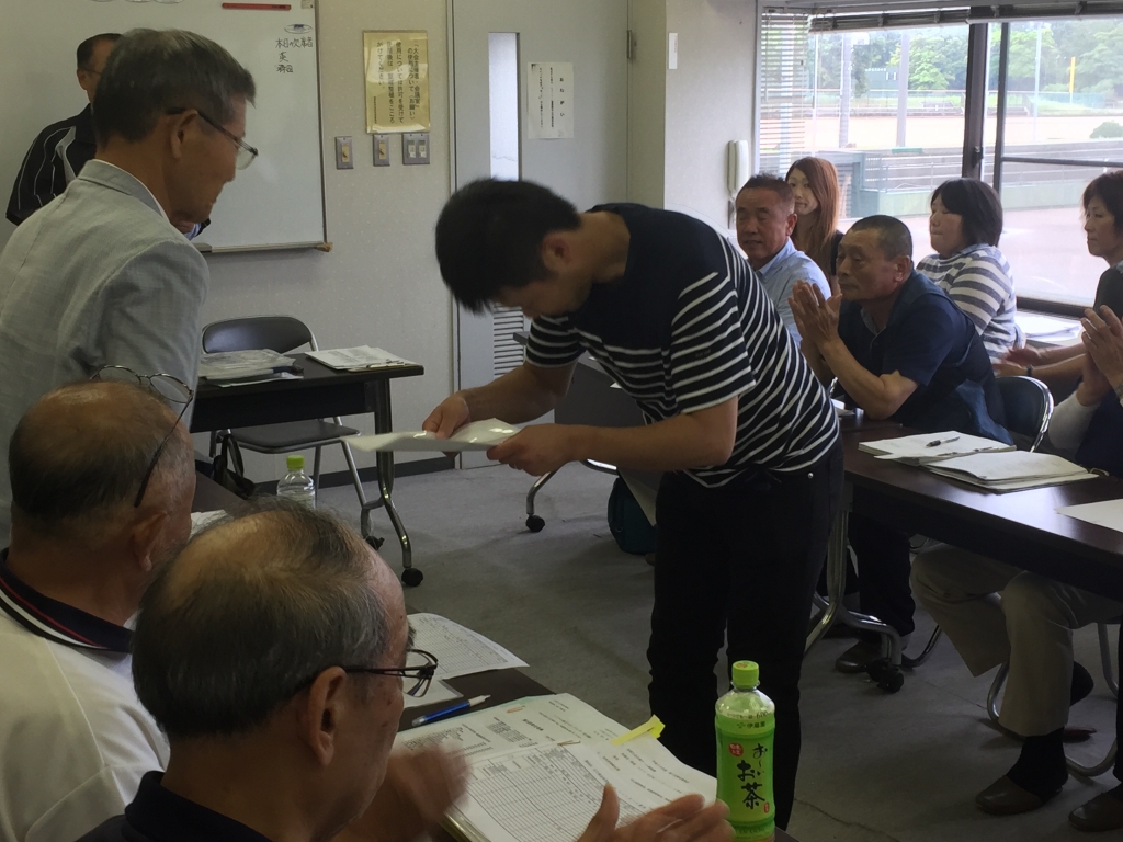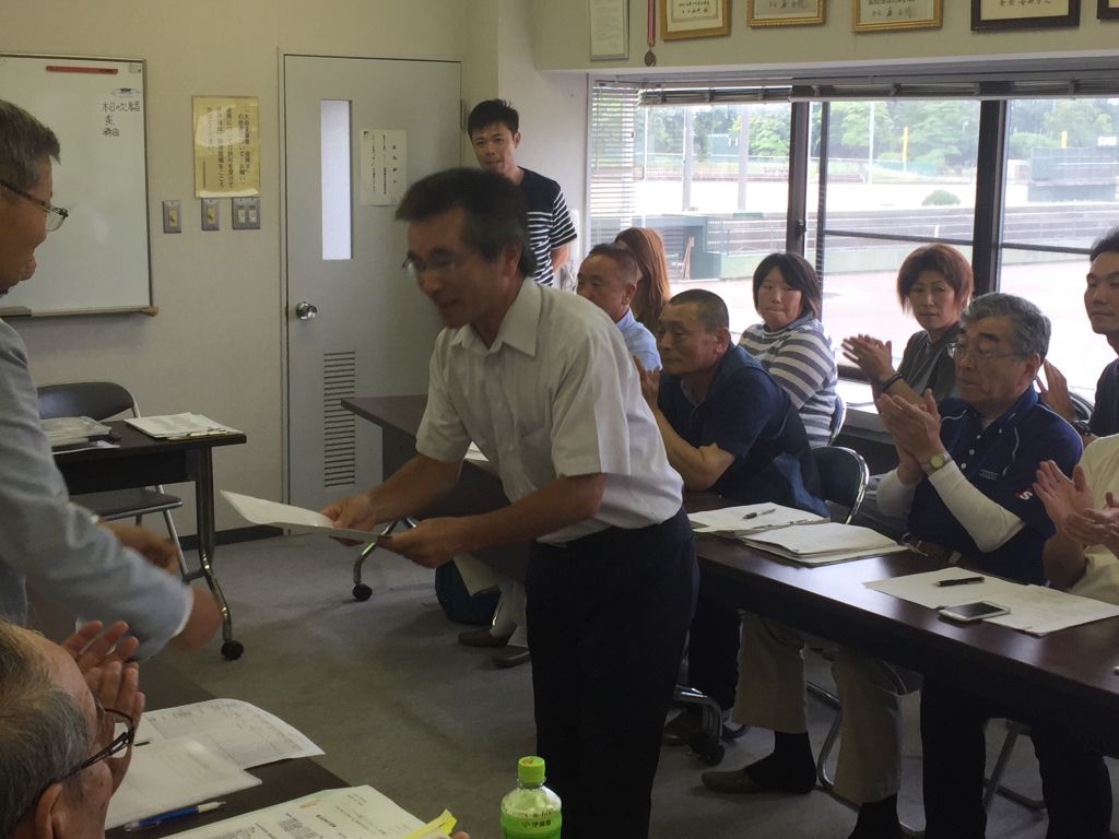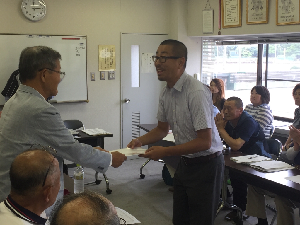 第5回常任理事会 激励費授与式 2017.07.01 石川県の予選会を勝ち抜いたチームに全国大会での活躍を 期待して本日、「激励費の授与式」が行われました。 <石川県代表のチーム一覧> ・コマニー㈱ ・クラブ金沢 ・十一屋クラブ ・津幡クラブ ・TKD ・星稜高校 ・金沢高校 ・能美GY ・伏見台RM