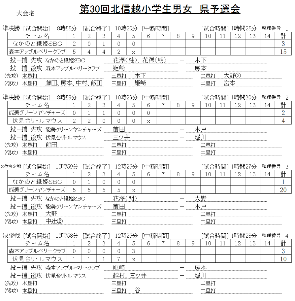 第30回北信越小学生男女 県予選会 記録(スコア―)