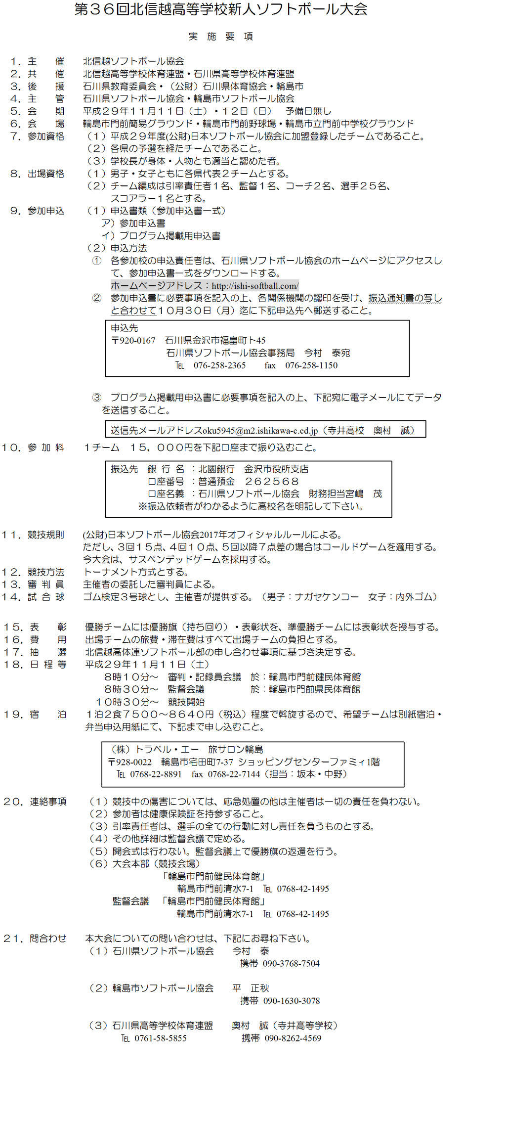 第36回北信越高等学校新人ソフトボール大会 実地要項 2017.10.16 大会参加申込書(事務局用) 大会参加申込書(プログラム用) 組合せ 男子の部 組合せ 女子の部 会場案内図 ご宿泊・昼食弁当のご案内