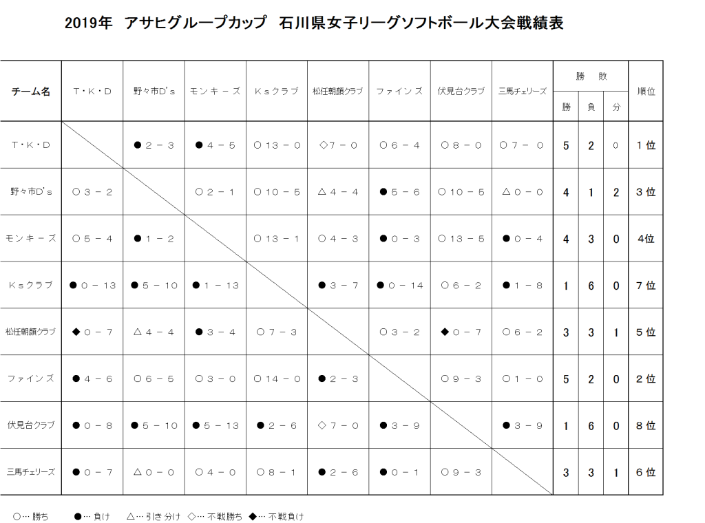 2019年度 石川県女子リーグ大会 表彰式の模様 2019.12.12 ・日 時 令和元年11月24日(日) ・場 所 金沢ニューグランドホテル <成績結果> *対戦チーム成績 優勝チーム<T・K・D> 準優勝チーム<ファインズ> 第3位チーム<野々市D’s>