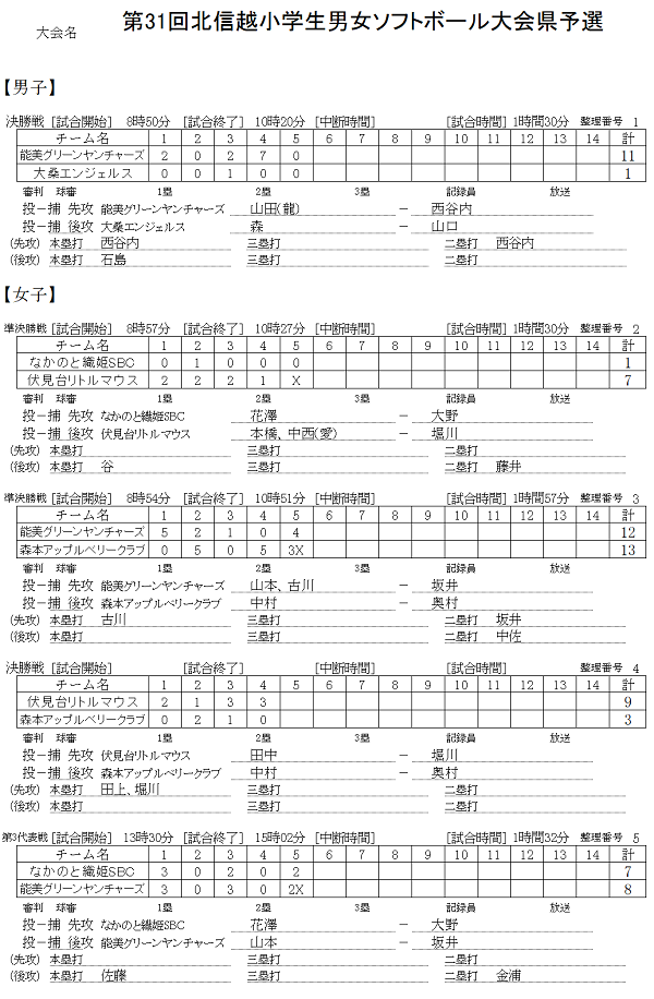 第31回北信越小学生男女大会県予選 小学第31回北信越小学生男女大会県予選 2018.07.24 記録(スコア―) 【男子】 優勝チーム<能美グリーンヤンチャーズ> 【女子】 優勝チーム<伏見台リトルマウス> 準優勝チーム<森本アップルベリークラブ>