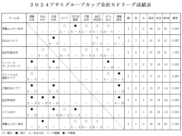 2024アサヒグループカップ金沢SFリーグ 成績(第4節終了) 2024.07.17 成績表(PDF) 第1節スコア(記録4号) 第2節スコア(記録4号) 第3節スコア(記録4号) 第4節スコア(記録4号)